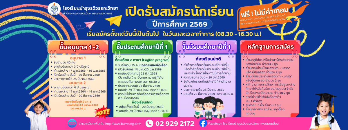 หน้าแรก \\ที่นี่บำรุง... ผู้อำนวยการสถานศึกษา ข่าวประชาสัมพันธ์ ประกาศรายชื่อนักเรียนเข้าเรียนในระดับชั้นมัธยมศึกษาปีที่ 1 ปีการศึกษา 2569 ประกาศรายชื่อนักเรียนเข้าเรียนในระดับชั้นอนุบาลปีการศึกษา 2569 ประกาศรายชื่อนักเรียนเข้าเรียนในระดับชั้นประถมศึกษาปีที่1 ปีการศึกษา 2569 รายชื่อนักเรียนที่ผ่านการวัดความสามารถทั่วไปและสอบสัมภาษณ์ชั้นประถมศึกษาปีที่ 1 ปีการศึกษา 2569 โครงการห้องเรียนสองภาษา ชุดเครื่องแบบนักเรียนโรงเรียนบำรุงรวิวรรณวิทยา รายชื่อผู้มีสิทธิ์เข้ารับการวัดความสามารถทั่วไปและสอบสัมภาษณ์ชั้นประถมศึกษาปีที่ 1 ปีการศึกษา 2569 โครงการห้องเรียนสองภาษา ประกาศโรงเรียนบํารุงรวิวรรณวิทยา เรื่อง การรับนักเรียนของโรงเรียนบํารุงรวิวรรณวิทยา ปีการศึกษา 2569 ระเบียบการรับสมัครนักเรียน ปีการศึกษา 2569 ประกาศโรงเรียนบำรุงรวิวรรณวิทยา เรื่อง การรับนักเรียนชั้นประถมศึกษาปีที่ 1 โครงการโรงเรียนสองภาษา หลักสูตรสองภาษา (ไทย-อังกฤษ) Bilingual (Thai-English) รายละเอียดการรับสมัครนักเรียน ปีการศึกษา 2569 5 กรกฎาคม 2568 นายชัชชาติ สิทธิพันธุ์ ผู้ว่าราชการ กรุงเทพมหานครและคณะได้เข้ามา ตรวจเยี่ยมโรงเรียนบำรุงรวิวรรณวิทยา โครงการส่งเสริมและพัฒนาเด็กและเยาวชนในถิ่นทุรกันดาร กิจกรรมโรงเรียน พิธีอัญเชิญพระพุทธชินราชเพื่อประดิษฐาน ณ หอพระโรงเรียนบำรุงรวิวรรณวิทยา 27 กุมภาพันธ์ 20261 มีนาคม 2026Bumrungกิจกรรมโรงเรียน ซักซ้อมการปฏิบัติตน กรณีเกิดสถานการณ์ฉุกเฉิน 23 กุมภาพันธ์ 20261 มีนาคม 2026Bumrungกิจกรรมโรงเรียน กิจกรรม English from song 20 กุมภาพันธ์ 20261 มีนาคม 2026Bumrungกิจกรรมโรงเรียน กิจกรรมตลาดนัดมือสอง BR ขายทุกอย่าง 19 กุมภาพันธ์ 20261 มีนาคม 2026Bumrungกิจกรรมโรงเรียน กิจกรรม” ตรุษจีน 2026 “ 17 กุมภาพันธ์ 20261 มีนาคม 2026Bumrungกิจกรรมโรงเรียน กิจกรรมหน่วยลูกเสือจิตอาสาพระราชทาน 16 กุมภาพันธ์ 20261 มีนาคม 2026Bumrungกิจกรรมโรงเรียน กิจกรรมประกวดโครงงานและสิ่งประดิษฐ์ 13 กุมภาพันธ์ 20261 มีนาคม 2026Bumrungกิจกรรมโรงเรียน ให้ความรู้ในโอกาสวันแห่งความรัก 13 กุมภาพันธ์ 20261 มีนาคม 2026Bumrungกิจกรรมโรงเรียน ค่ายคณิตศาสตร์ 12 กุมภาพันธ์ 20261 มีนาคม 2026Bumrungกิจกรรมโรงเรียน การจัดการเรียนการสอน การศึกษาปฐมวัยโรงเรียนใช้หลักสูตรการศึกษาปฐมวัย พุทธศักราช 2560 เป็นแนวทางในการจัดการศึกษา อ่านต่อ การศึกษาขั้นพื้นฐานโรงเรียนใช้หลักสูตรแกนกลางการศึกษาขั้นพื้นฐาน พุทธศักราช 2551 เป็นแนวทางในการจัดการศึกษา อ่านต่อ แหล่งเรียนรู้ในโรงเรียนโรงเรียนมีแหล่งเรียนรู้ภายในโรงเรียนอย่างหลากหลายเพื่อเป็นแหล่งเรียนรู้ของนักเรียนและชุมชน อ่านต่อ